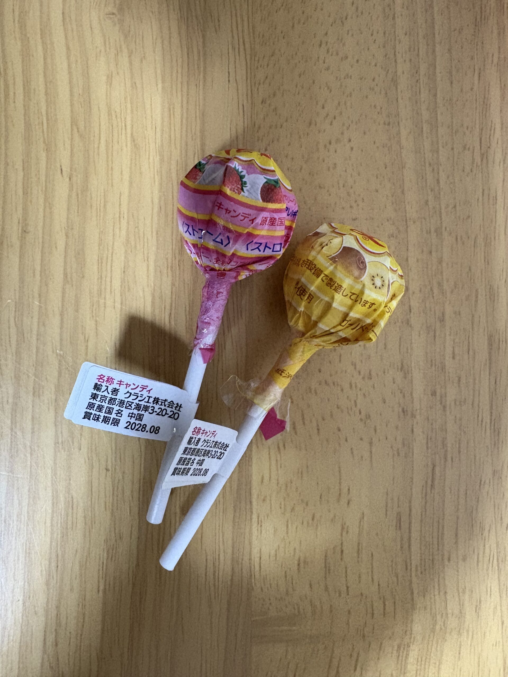 ん……?と思って袋を確認すると、 本当にチュッパチャップスが2本、 赤(ピンク?)と黄色のものが入っていた。